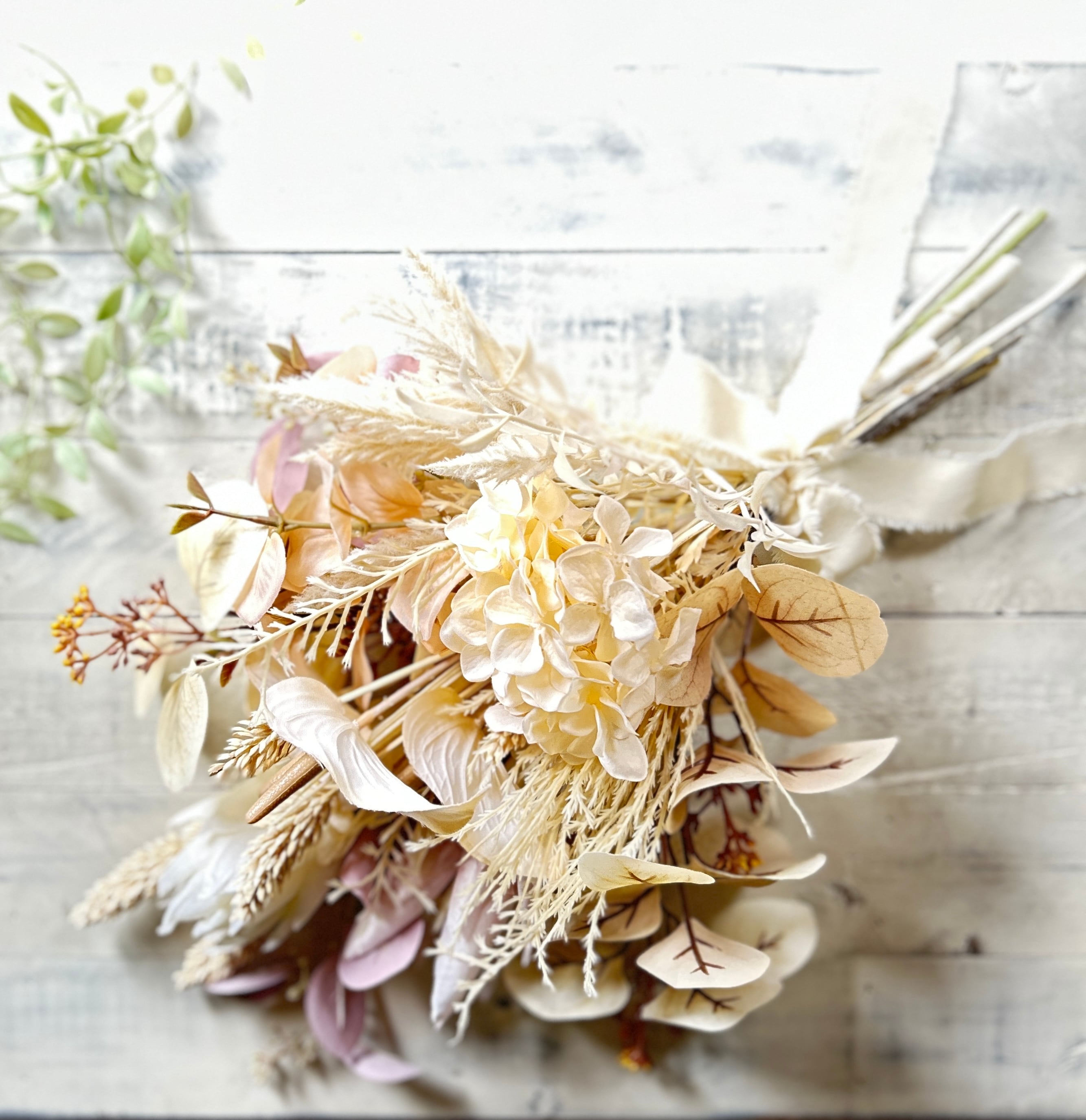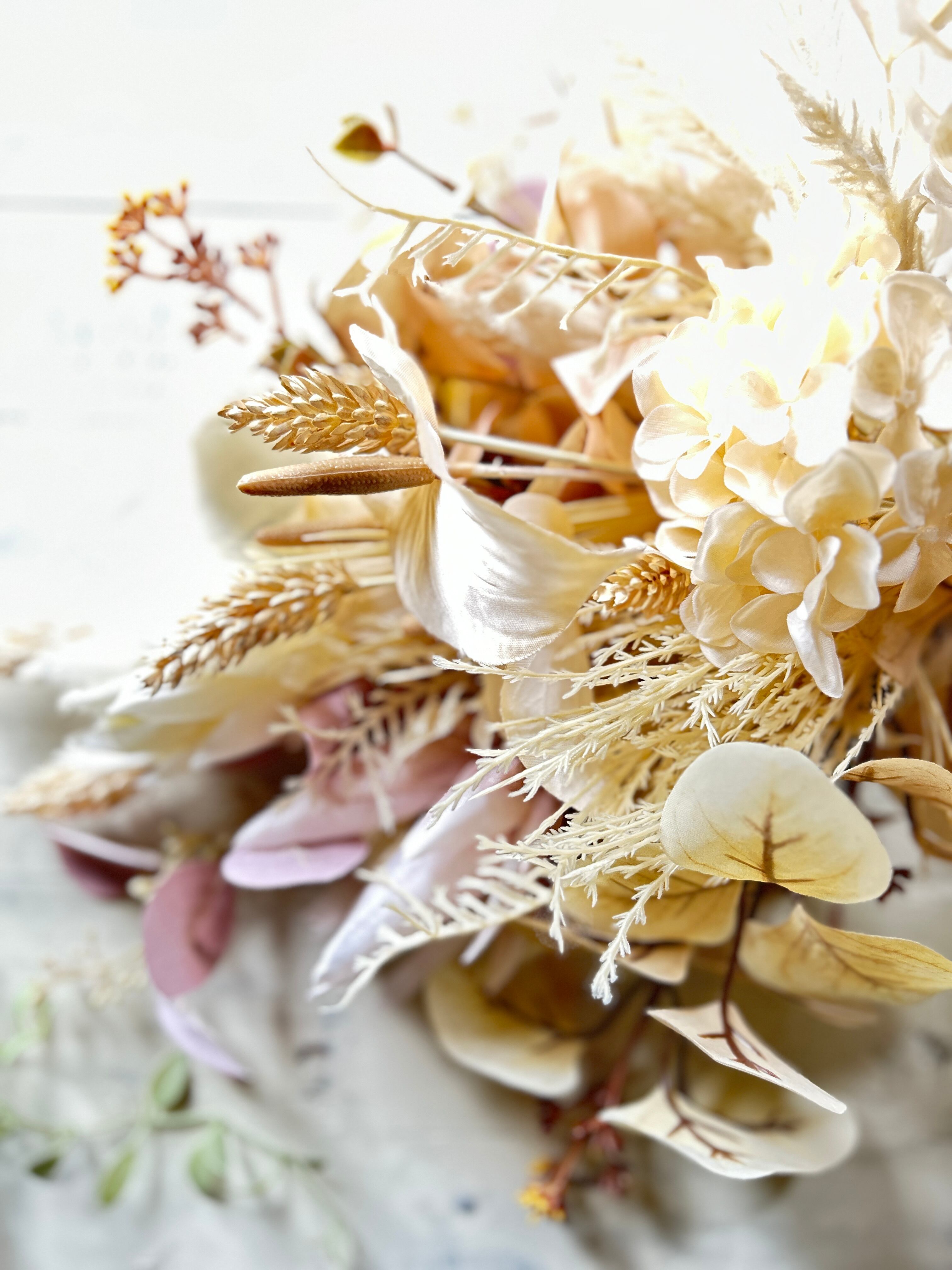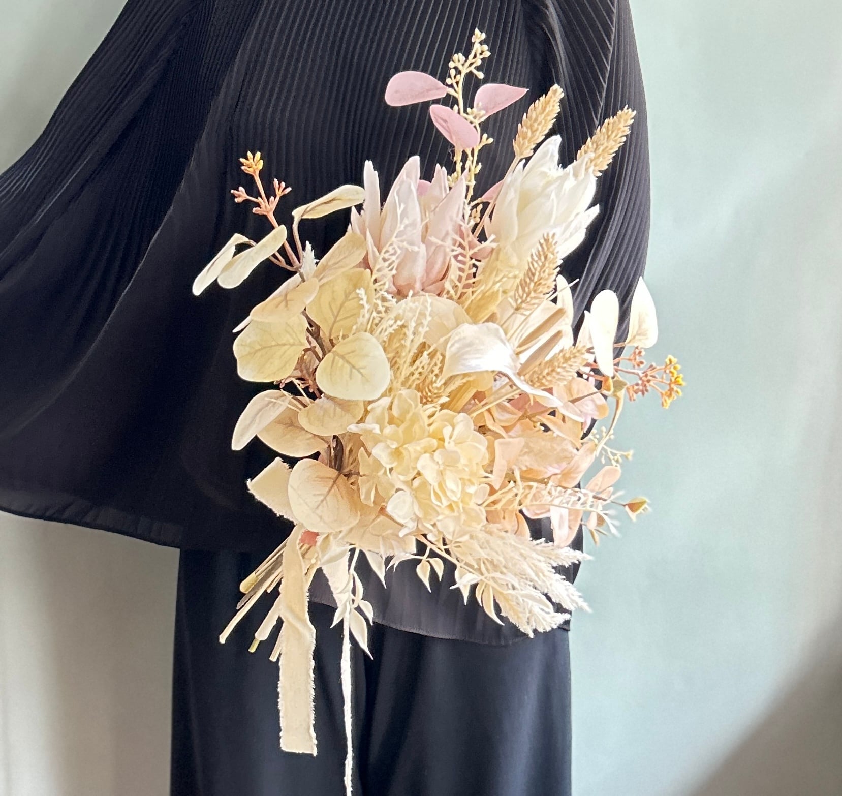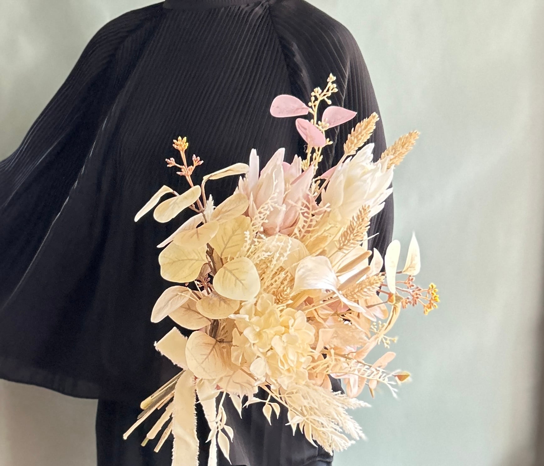 生花の美しさをそのまま引き出したような高品質なアーティフィシャルフラワー(造花)でお作りしています。人気のプロテアとアンスリウムを合わせたデザイン。アイボリー系でまとめた、おしゃれでシンプルかわいいドライフラワー風クラッチブーケです。
